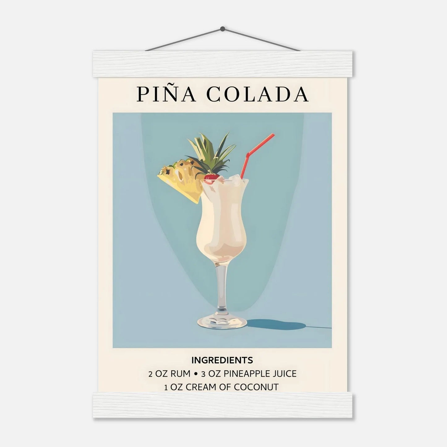 Whether you're decorating a mid-century modern kitchen or a laid-back bar area, this Piña Colada poster with its magnetic hanger display is the perfect way to add colour, character, and a breezy tropical feel to your space!